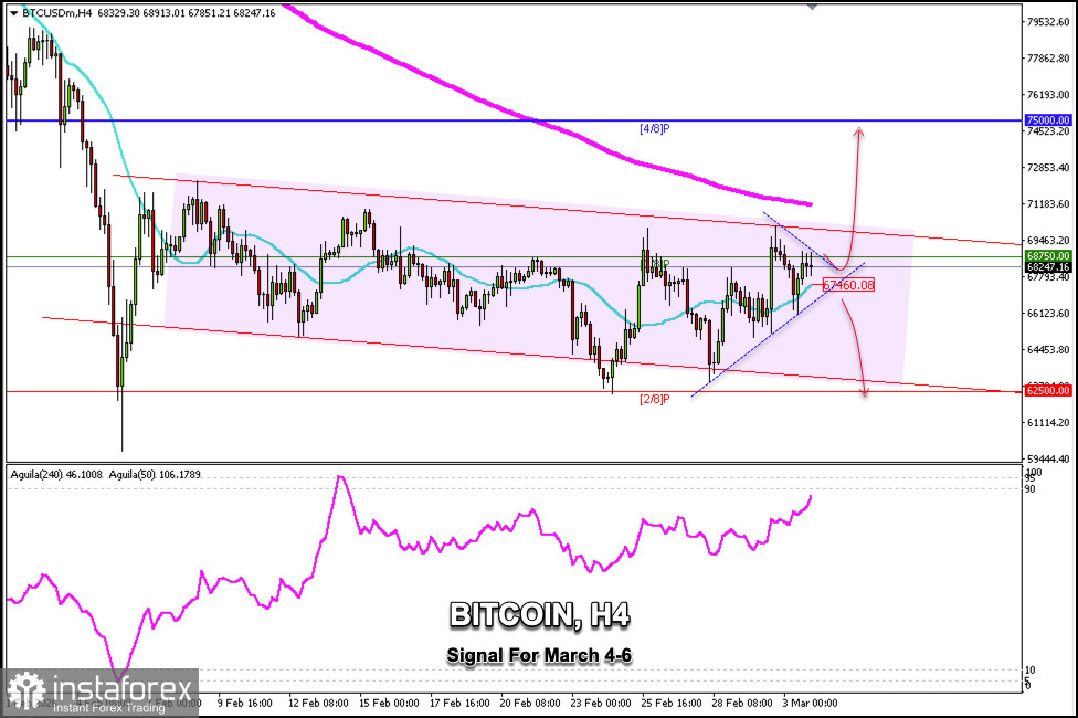 على الرسم البياني لفاصل 4 ساعات (H4)، يمكننا أن نرى أن Bitcoin قد يواصل ارتفاعه خلال الساعات المقبلة، وقد يصل إلى المتوسط المتحرك الأسي لـ200 فترة (200 EMA) بالقرب من مستوى 71,000 دولار. وبمجرد اختراق هذه المنطقة، يمكن أن يستهدف Bitcoin مستوى 75,000 دولار.