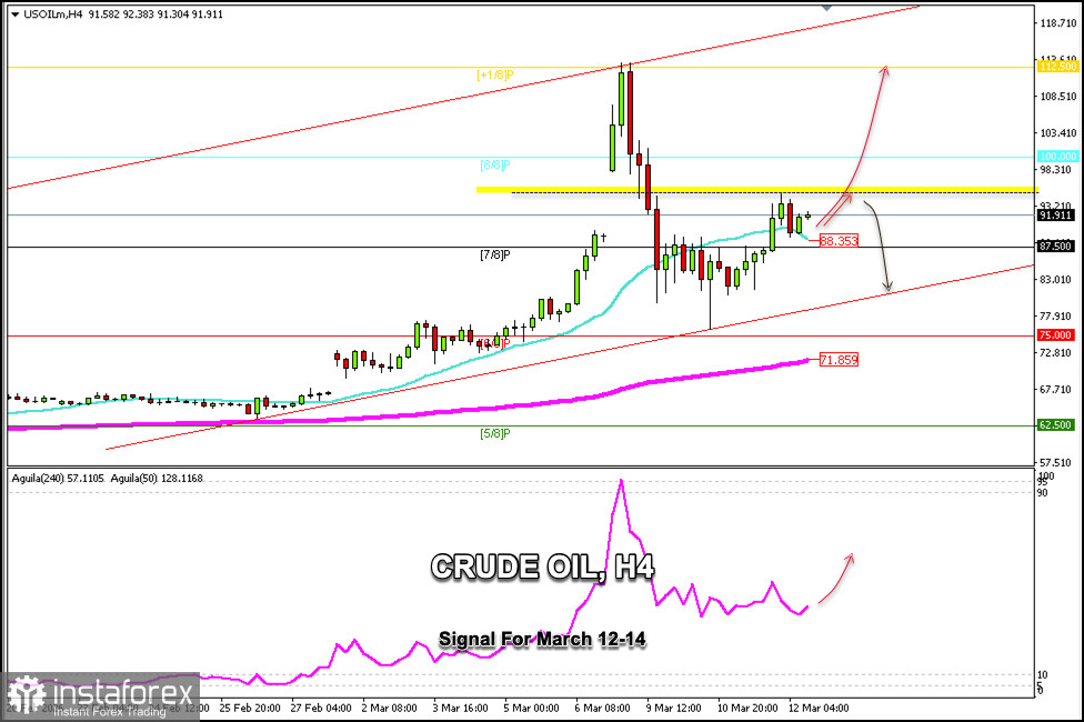 لا تزال النظرة العامة لخام النفط صعودية، ولذلك يمكن توقع حدوث تراجع (تصحيح) باتجاه المتوسط المتحرك البسيط 21 (21 SMA) قرب مستوى 88 دولار للبرميل، ويمكن اعتبار هذا التراجع إشارة لمواصلة الشراء بأهداف عند مستوى 100 دولار. وقد يتمكن خام WTI حتى من الوصول إلى مستوى +1/8 Murray قرب 112 دولار للبرميل في الأيام القادمة.