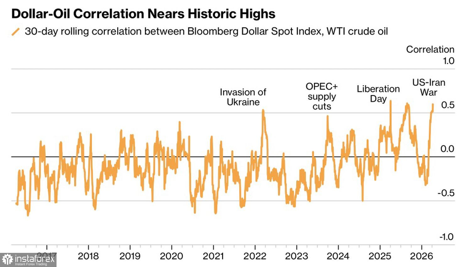 09.04.2026 16:21Единственным фактором, который в настоящее время определяет судьбу различных активов, являются цены на нефть. Самый стремительный обвал Brent с 2020 на фоне новости о переговорах США и Ирана подбросил вверх фондовые индексы и обрушил котировки американского доллара. 30-дневная корреляция между гринбэком и черным золотом достигла максимальных отметок со времен объявления Дональдом Трампом максимальных тарифов с 1930-х в апреле прошлого года.