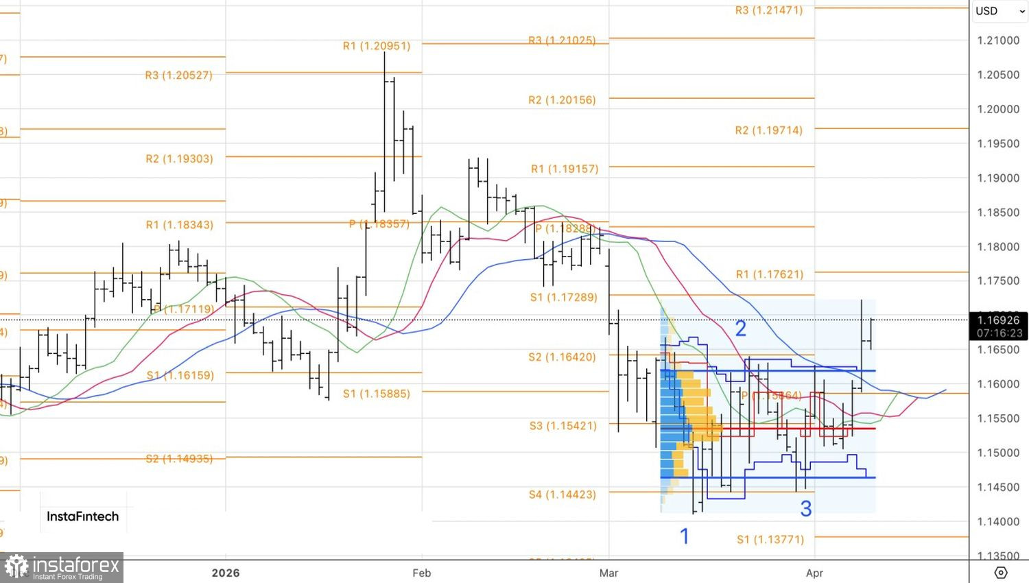 Технически на дневном графике EUR/USD продолжается реализация разворотного паттерна 1-2-3. Пока котировки находятся выше верхней границы диапазона справедливой стоимости 1,1465-1,162, балом правят «быки». С другой стороны, неспособность покупателей взять штурмом пивот-уровни 1,173 и 1,176 станет признаком их слабости и поводом для формирования коротких позиций по евро против американского доллара.