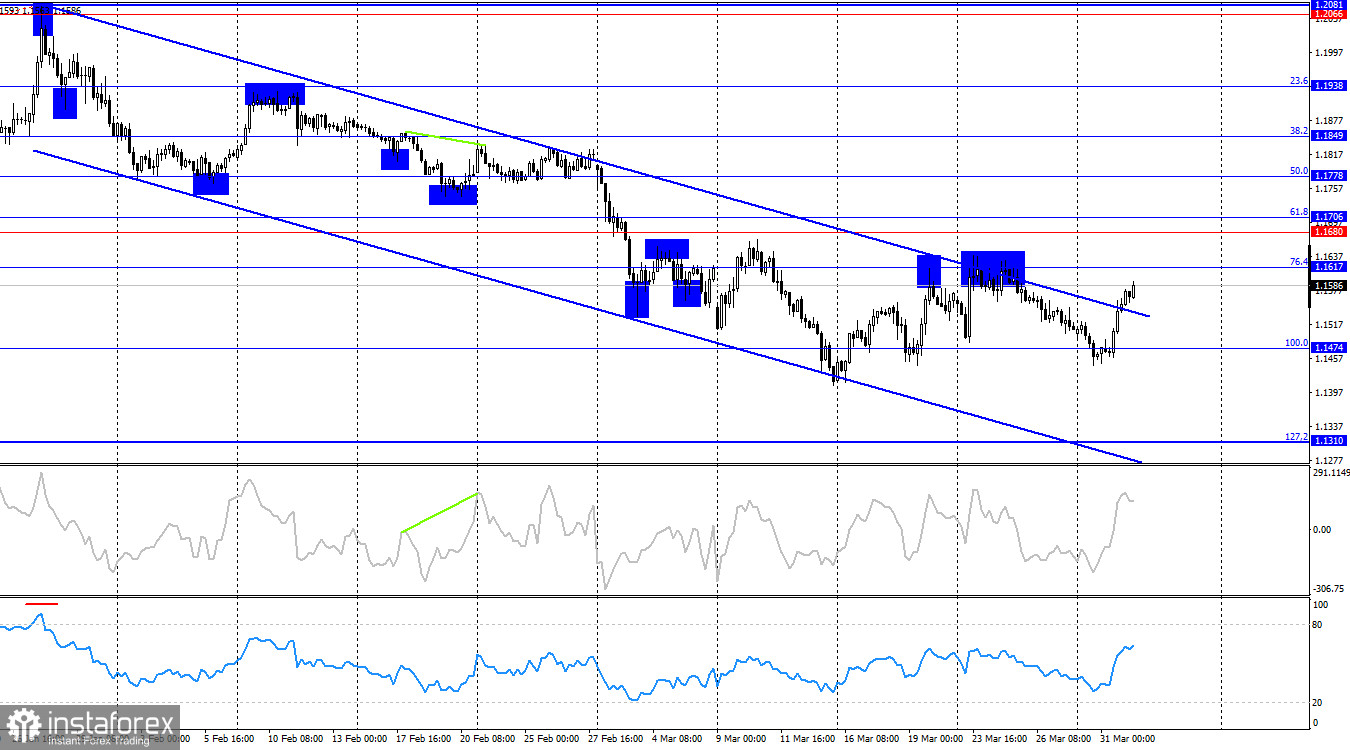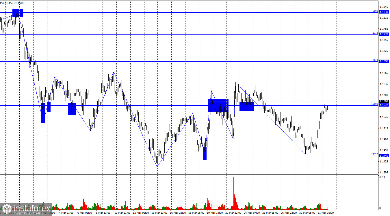 Во вторник информационный фон был достаточно интересным. Начался день с новых выступлений Джерома Пауэлла и Дональда Трампа, каждое из которых поддержало быков. Трамп готов отдать приказ о завершении «иранской операции» в ближайшее время, а Джером Пауэлл не видит оснований для ужесточения параметров ДКП. Оба этих фактора не поддерживают медведей EUR/USD и доллар. Помимо этого, уровень инфляции в Евросоюзе вырос по итогам марта до 2,5% г/г. И хоть это значение ниже ожиданий трейдеров, нельзя не отметить сильный рост индекса потребительских цен с началом энергетического кризиса. Не все экономисты ожидают ужесточения денежно-кредитной политики ЕЦБ в апреле, но все трейдеры понимают: если инфляция будет расти такими темпами, то Европейскому регулятору придется вмешаться повышением процентных ставок. Для евровалюты это позитивные вести. Во вторник информационный фон впервые за несколько недель повернулся к европейской валюте передом, что и позволило быкам провести атаку.
