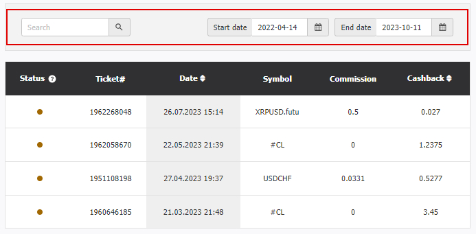 Кешбэк бағдарламасы былай жұмыс істейді: сіз қалыпты режимде сауда жасап, таңдалған құралдар бойынша сауда-саттықтарды жабасыз. Әрбір сауда күнінің соңында жабылған сауда-саттықтар клиенттік кабинетте (КК) көрсетіледі. Кешбэк есептелуіне қатысты барлық өзгерістер КК/Қаржы операциялары/Кешбэк мекен-жайы бойынша бақылауға болады. Осы бөлімде күнделікті барлық транзакциялар көрсетіледі, құрал бойынша және тапсырыс нөмірі бойынша іздеу қолжетімді, сондай-ақ сауда-саттықтарды көрсету кезеңі мен тиісті күйлерді таңдау мүмкіндігі бар.