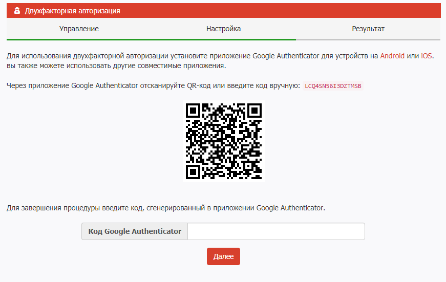 3. После этого шага активация двухфакторной авторизации будет завершена, и при каждом входе в кабинет клиента помимо пароля будет запрошен шестизначный код из приложения Google Authenticator.
