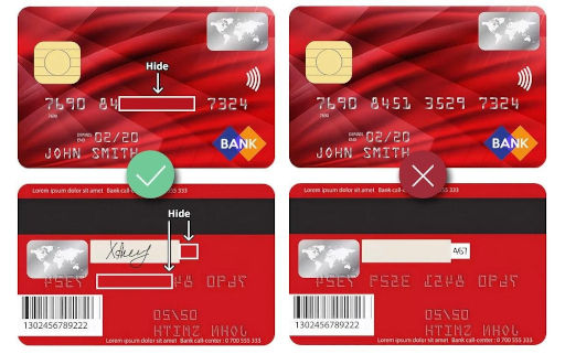 Để bảo mật cho bạn, chúng tôi yêu cầu bạn ẩn một phần số thẻ ở mặt trước và mặt sau của thẻ, chỉ để lại 6 số đầu và 4 số cuối. Ngoài ra, bạn cần ẩn mã CVC2 / CVV2 ở mặt sau.