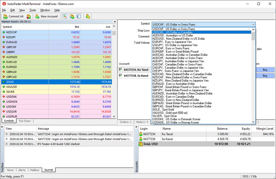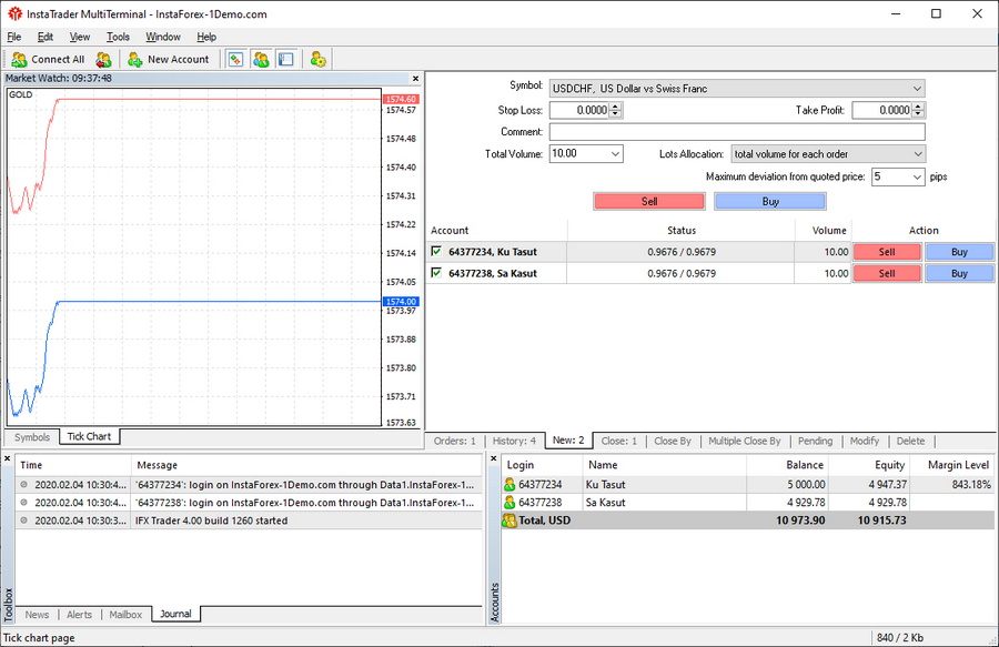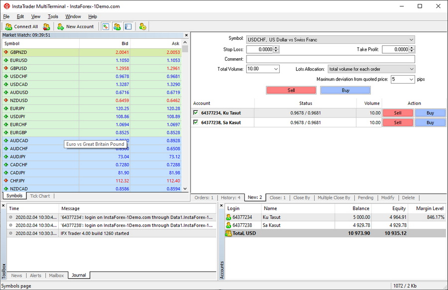 The MultiTerminal allows clients to work on several trading accounts at once. It is an ideal tool for traders who deal with account management, i.e. manage accounts of their clients.